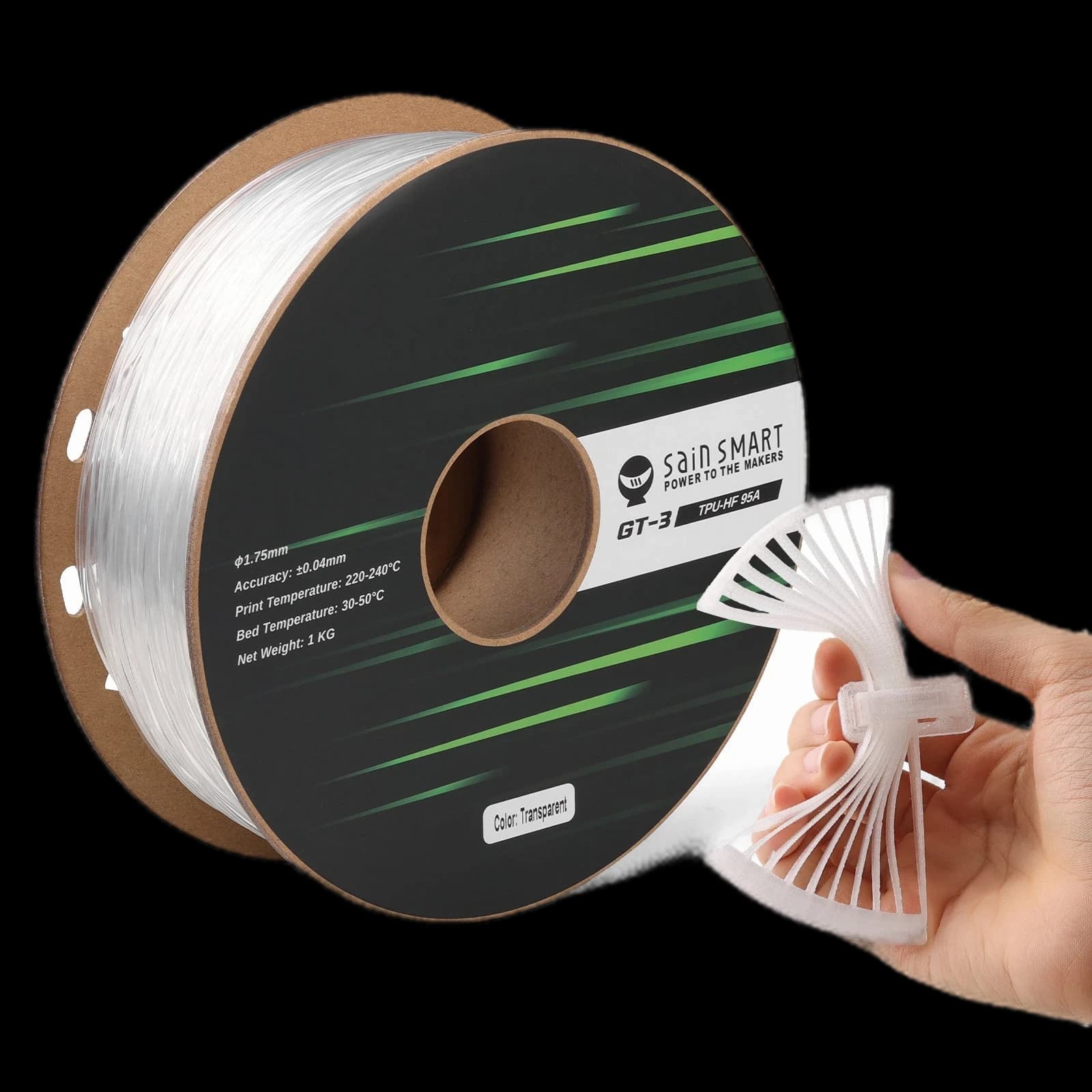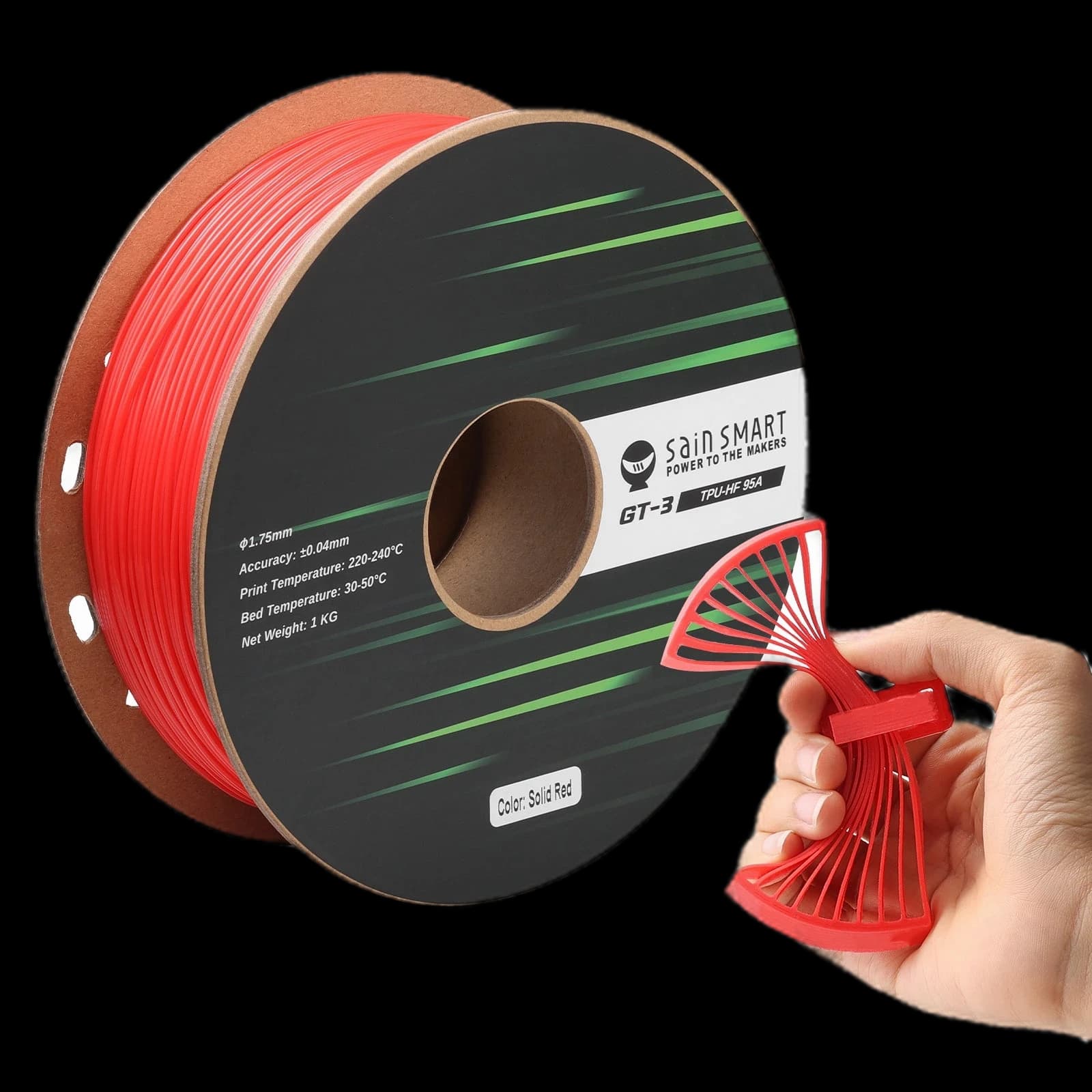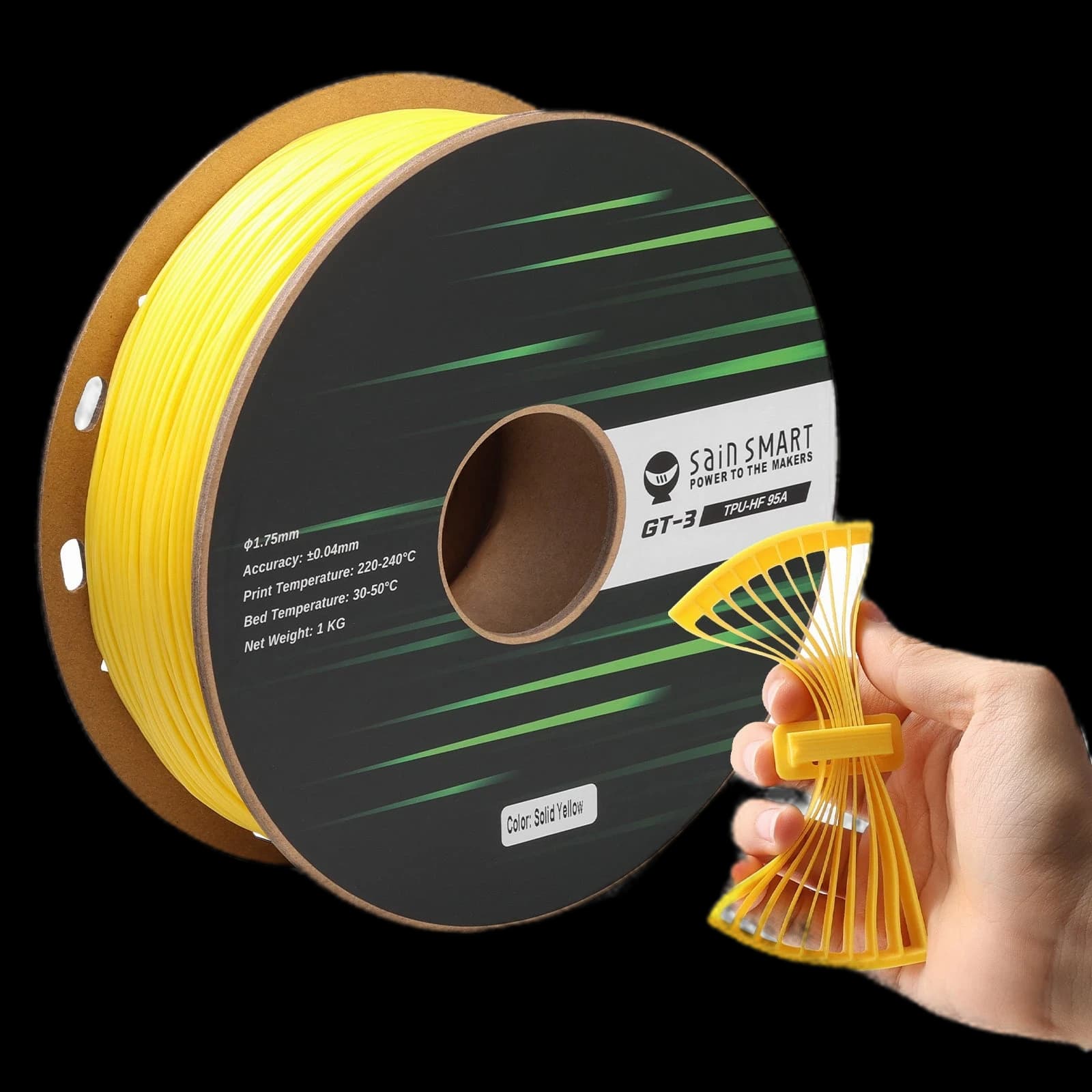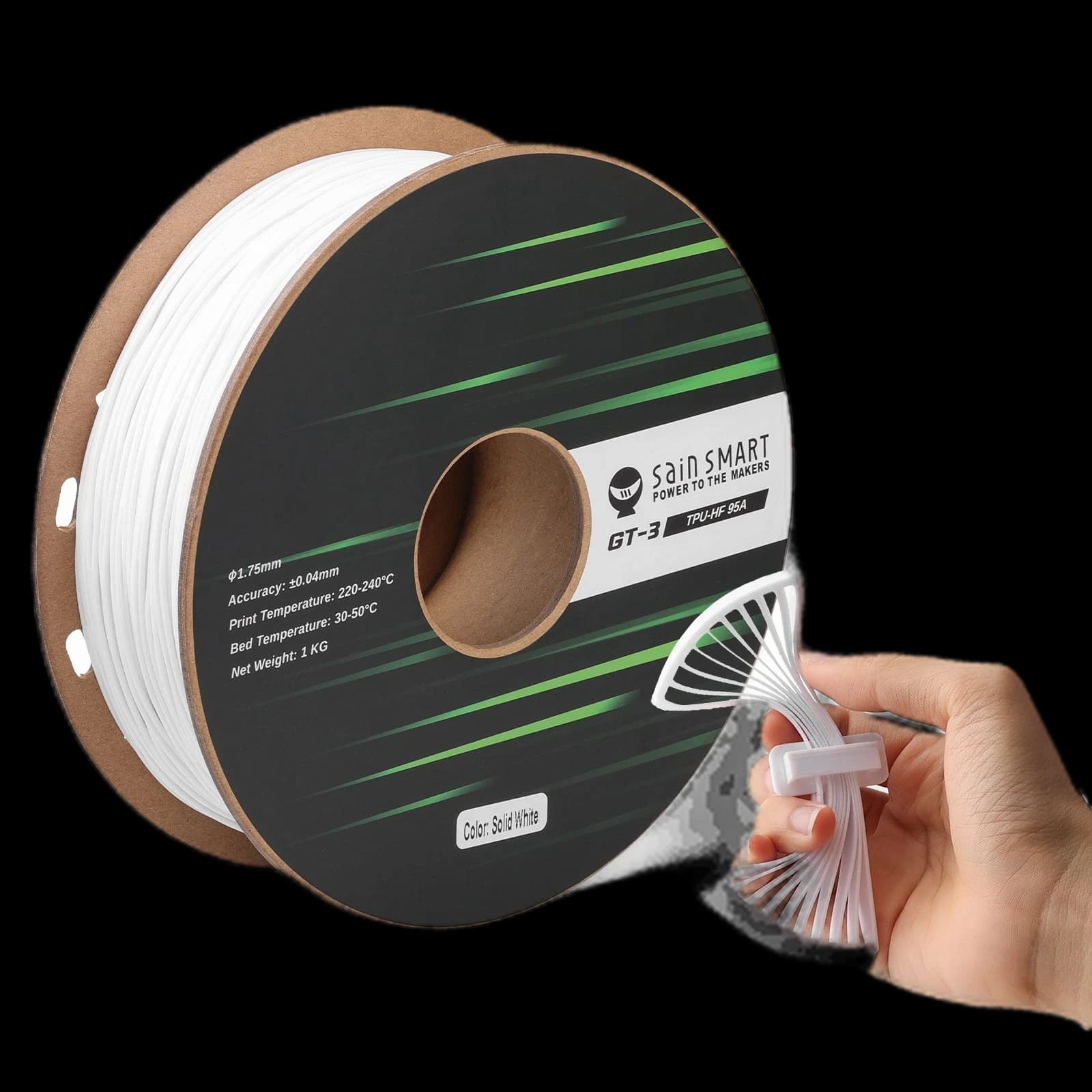 Découvrez le filament TPU flexible 95A SainSmart GT-3 à grande vitesse, conçu pour l'impression 3D rapide. Ce filament résistant aux UV est jusqu'à 5 fois plus rapide que le TPU standard, parfait pour produire des impressions résistantes et élastiques avec facilité. Avec une tolérance de précision de ±0,04 mm et un diamètre de 1,75 mm, il garantit des résultats de haute qualité et précis à chaque fois. Disponible dans une large gamme de couleurs, notamment Noir, Blanc, Rouge, Jaune, Bleu, Vert et Transparent, il offre des options polyvalentes pour vos projets. Compatible avec la plupart des imprimantes 3D, y compris Bambu Lab, cette bobine de 1 kg est idéale pour les professionnels et les amateurs à la recherche de vitesse et de flexibilité. Élevez votre expérience d'impression 3D avec le SainSmart GT-3 TPU.