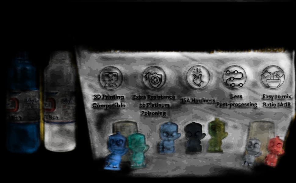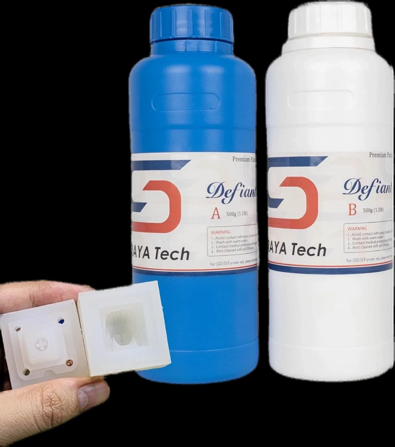 Siraya Tech Platinum Silicone - Defiant 15 est un silicone de durcissement au platine avancé conçu pour résister à l'inhibition de durcissement par les résines imprimées en 3D. Avec son ratio de mélange simple 1:1 et sa faible viscosité, il permet aux débutants comme aux professionnels de créer des moules réutilisables à haute résolution pour la résine, les aliments, la cire, et plus encore. Ce produit est certifié sans danger pour les aliments et compatible avec les résines Siraya Tech Fast/Build/Blu/Simple V2/Sculpt. Veuillez noter que les autres marques de résine n'ont pas été testées.